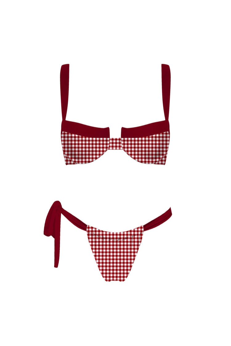 - Red gingham bikini bottom with a playful, retro-inspired vibe
