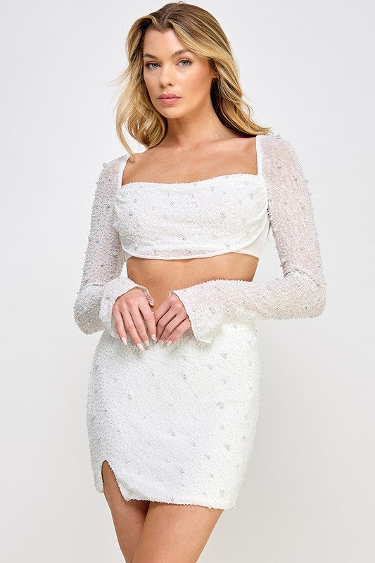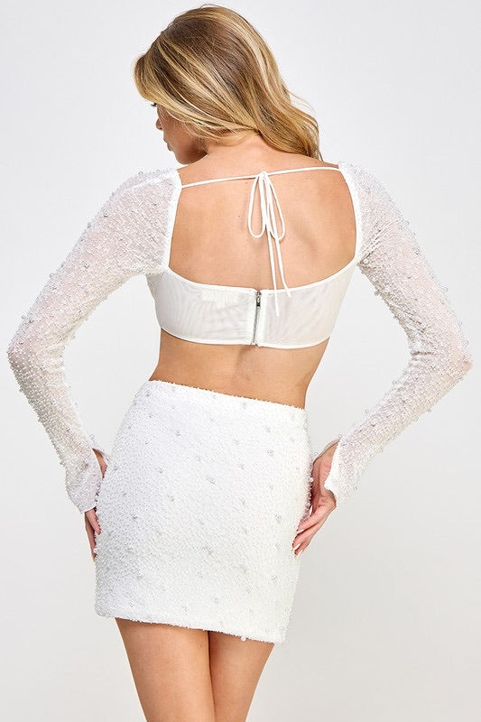 - Two-piece set: pearl-embellished top and matching mini skirt